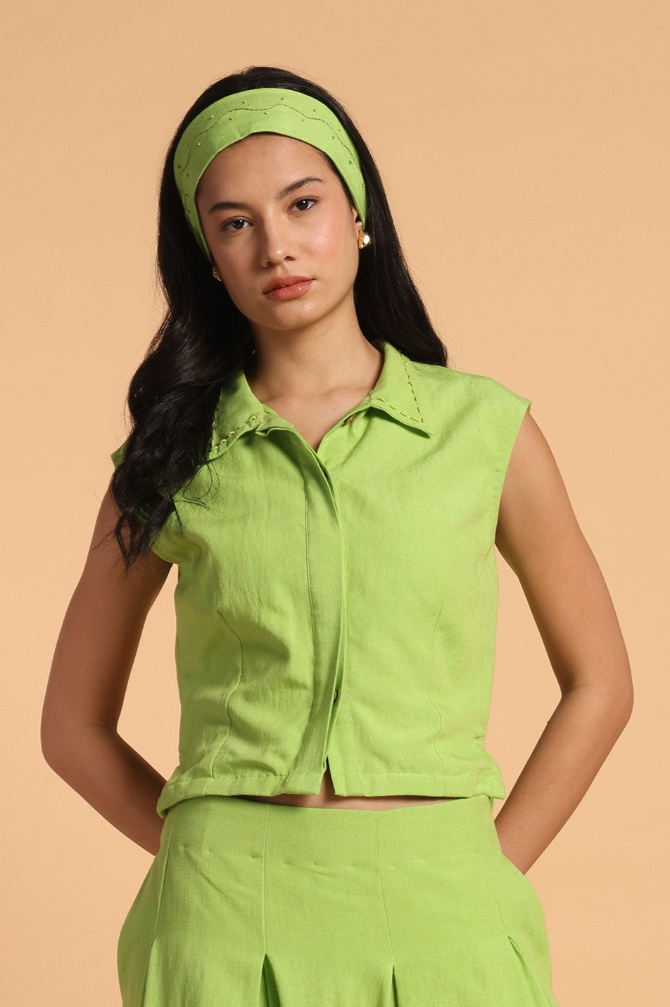 From The Kadamba Story. Crafted in a breathable lime green cotton linen 120 GSM, the Kadamba Embroidered Shirt features a clean, sleeveless silhouette with a sharp collared neckline and concealed placket. Hand-done beadwork along the collar and delicate Kantha stitching add quiet elegance. Designed for ease and structure, it’s perfect for creative workdays, festive mornings, or mindful everyday wear.